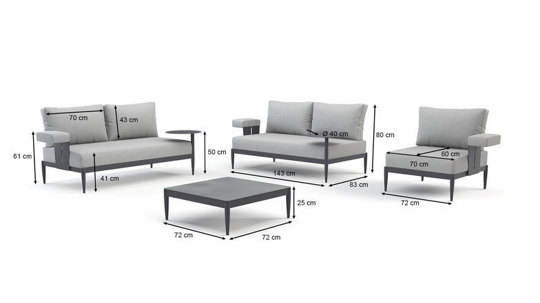 Réf. d'article 812112822 Coussins et matelas comme illustré, coussins très confortables, coussins dossier rembourrés, mousse synthétique, épaisseur coussins d'assise 13 cm, mousse synthétique, épaisseur coussins de dossier 20 cm, fibres synthétiques Qualité Poids maximal jusqu'a 120 kg par fauteuil, déperlant, éléments du canapé modulables, multifonctionnel, Accoudoir emboîtable, pas de vis, accoudoir emboîtable, surface de rangement latérale incluse, petite table: 360° pivotable Matériau Aluminium Montage assemblage nécessaire Plateau de table VSG - verre feuilleté securit, anthracite Contenu de la livraison 1x table basse, 2x canapé avec coussins, 1x fauteuil avec coussins, 3x accoudoir, 5x dossier avec coussins, 2x surface de rangement Nombres de places assises jusqu'à 5 Complément d'information Accessoires pour Alina disponibles sur le site Structure aluminium thermolaqué, solide, inoxydable, imperméable Genre Salons de jardin Housse déhoussables, lavables à 30°C, hautement résistant, fermeture-éclair sous patte, imperméable, teint dans la masse, Gris lune (chiné), 100 % Polyester, 200gr./m² Couleur anthracite Poids Fauteuil env. 10 kg, canapé env. 20 kg, Table env. 11 kg Bâche (Accessoires optionnels) protection contre la saleté et les rayons UV, disponible sur notre site , 90x85x60 cm, 2x 150x90x60 Consignes de sécurité