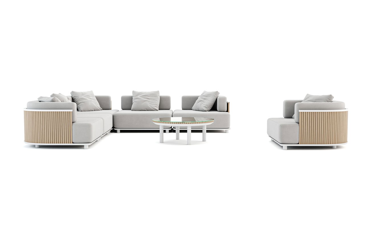 Salon en aluminium design Meloria avec lattes en teck disponible uniquement chez Living Zone. Livraison gratuite.