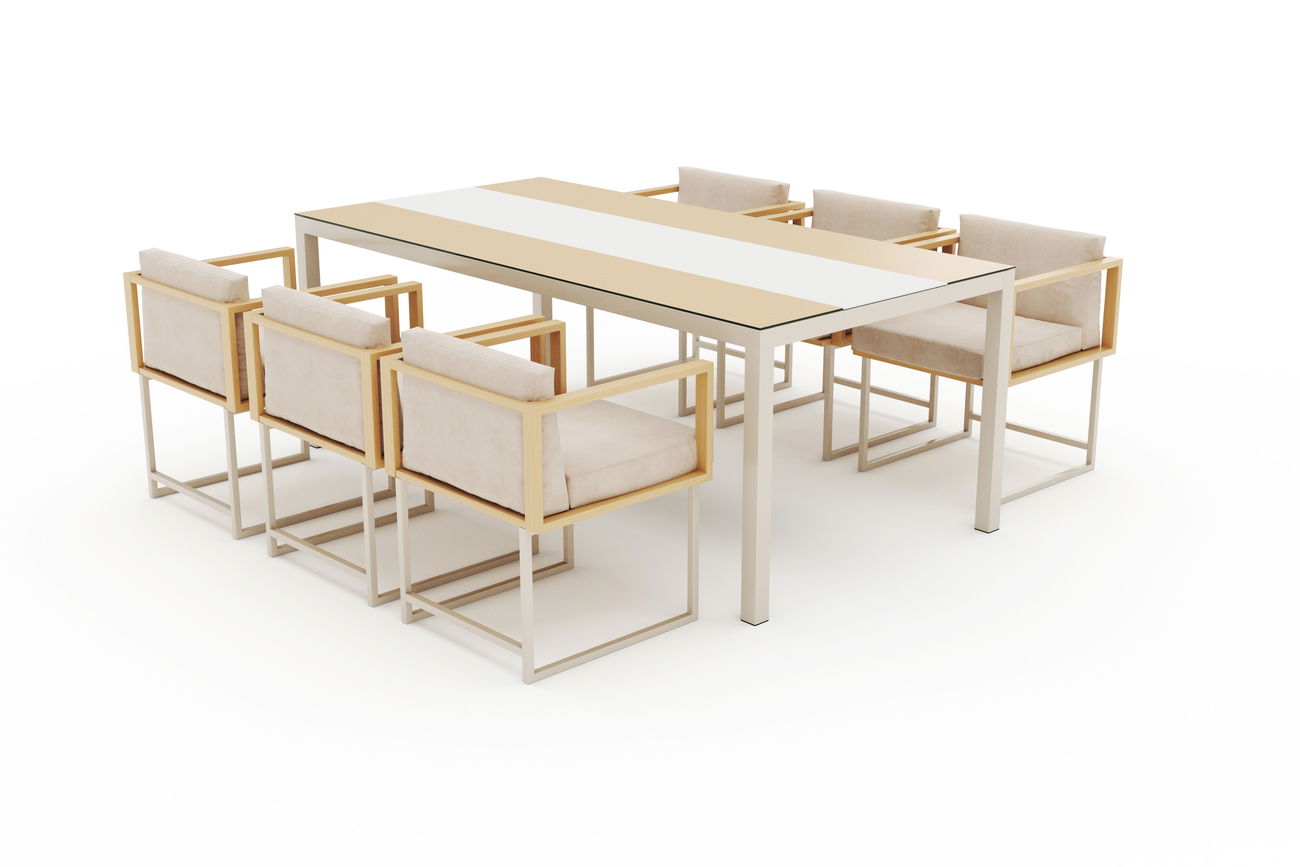La combinaison d'un cadre en aluminium robuste avec un revêtement d'aspect bois noble confère à l'ensemble une apparence naturelle et en même temps moderne. Le plateau de table soigneusement travaillé en matériau de haute qualité impressionne par sa durabilité et sa surface facile d'entretien. Les pieds de table élégants de couleur champagne créent un contraste harmonieux et complètent le design avec style.