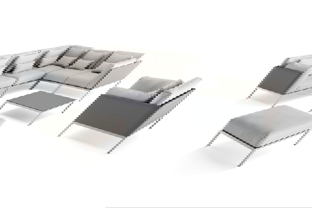 Avec un ensemble comprenant un pouf, un fauteuil, deux canapés centraux, un canapé d'angle, deux canapés de fin et une table basse, la Suite Lounge Max peut accueillir jusqu'à sept personnes. Le plateau de table en verre dépoli de 5 mm d'épaisseur complète parfaitement le design et crée une surface élégante et pratique pour vos divertissements en plein air.