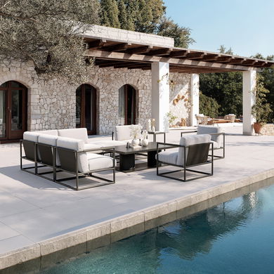 Le Verso Lounge Max déploie le langage graphique et architectural de cette série dans une version généreuse. La structure en aluminium anthracite forme des cadres géométriques évasés dont l'esthétique cubique crée une image d'ensemble structurée et ordonnée. Les lignes épurées confèrent un aspect moderne et délibérément minimaliste, donnant à l'ensemble une présence souveraine et sereine dans l'espace extérieur.