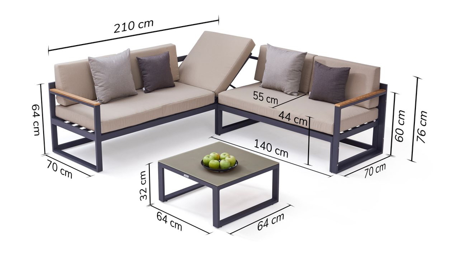 Un autre salon de la collection 2020, qui n'est pas seulement élégant, mais aussi pratique et polyvalent. Le canapé d'angle offre de la place pour 5 personnes. Le salon a un aspect ouvert et invite non seulement à la détente avec ses coussins confortables. En un tour de main, l'assise du canapé 3 places se transforme en une chaise longue confortable - plus rien ne s'oppose à un bain de soleil ! Le canapé 2 places peut être utilisé comme canapé individuel en montant les deux accoudoirs fournis, ou être combiné avec le canapé 3 places pour former un salon d'angle. Les dossiers en forme de coin offrent également un confort absolu. La petite table assortie est également thermolaquée, le plateau en verre dépoli s'harmonise en termes de couleur et s'intègre parfaitement dans le concept global. Les accoudoirs en aspect teck donnent à l'ensemble un look décontracté et moderne. Toutes les parties de l'ensemble peuvent également être installées séparément. Les coussins décoratifs assortis en graphite et gris sont inclus dans la livraison.